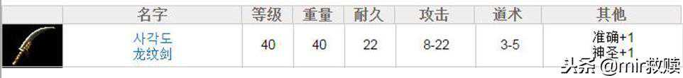 需要等级40级,重量40,持久22,攻击8—22,道术3—5,准确+1,神圣+1