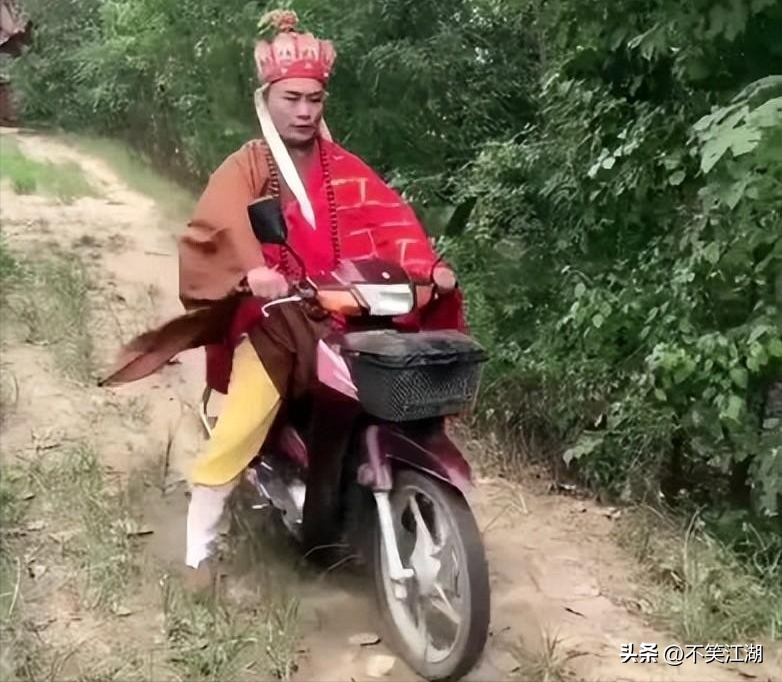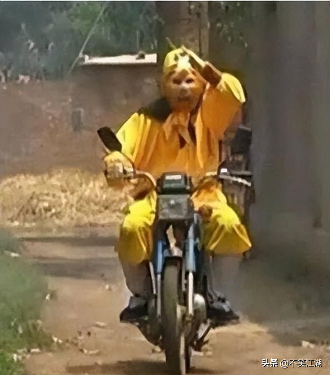 我们的齐天大圣在台下没有了筋斗云,也没有了跟斗十万八千里的法术,只能无奈地骑上自己的小摩托车,不得不说,这也是相当拉风的。而站在一旁的二师兄则走上了飙车的道路,