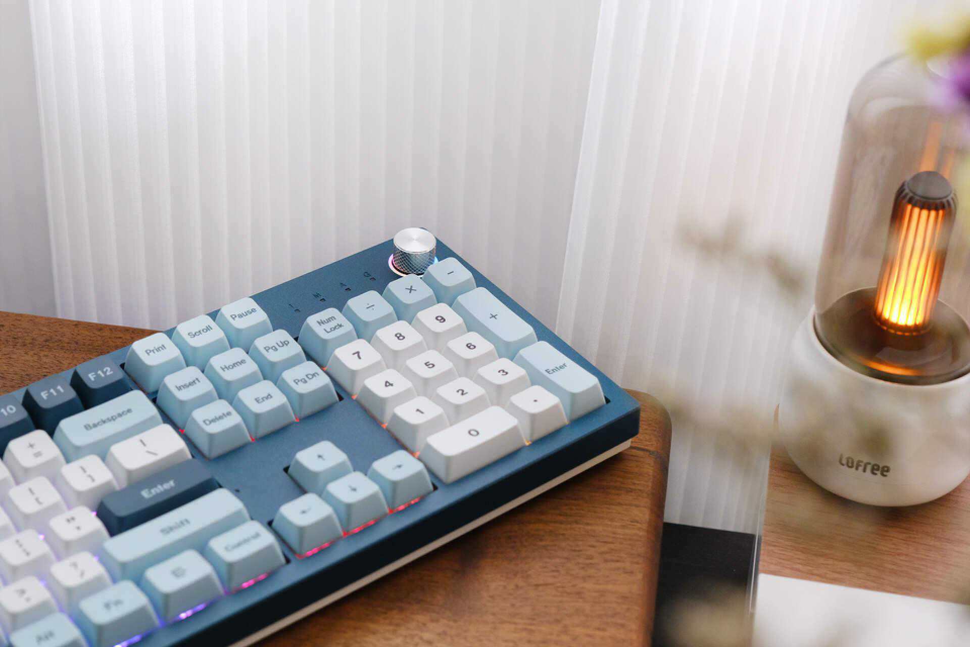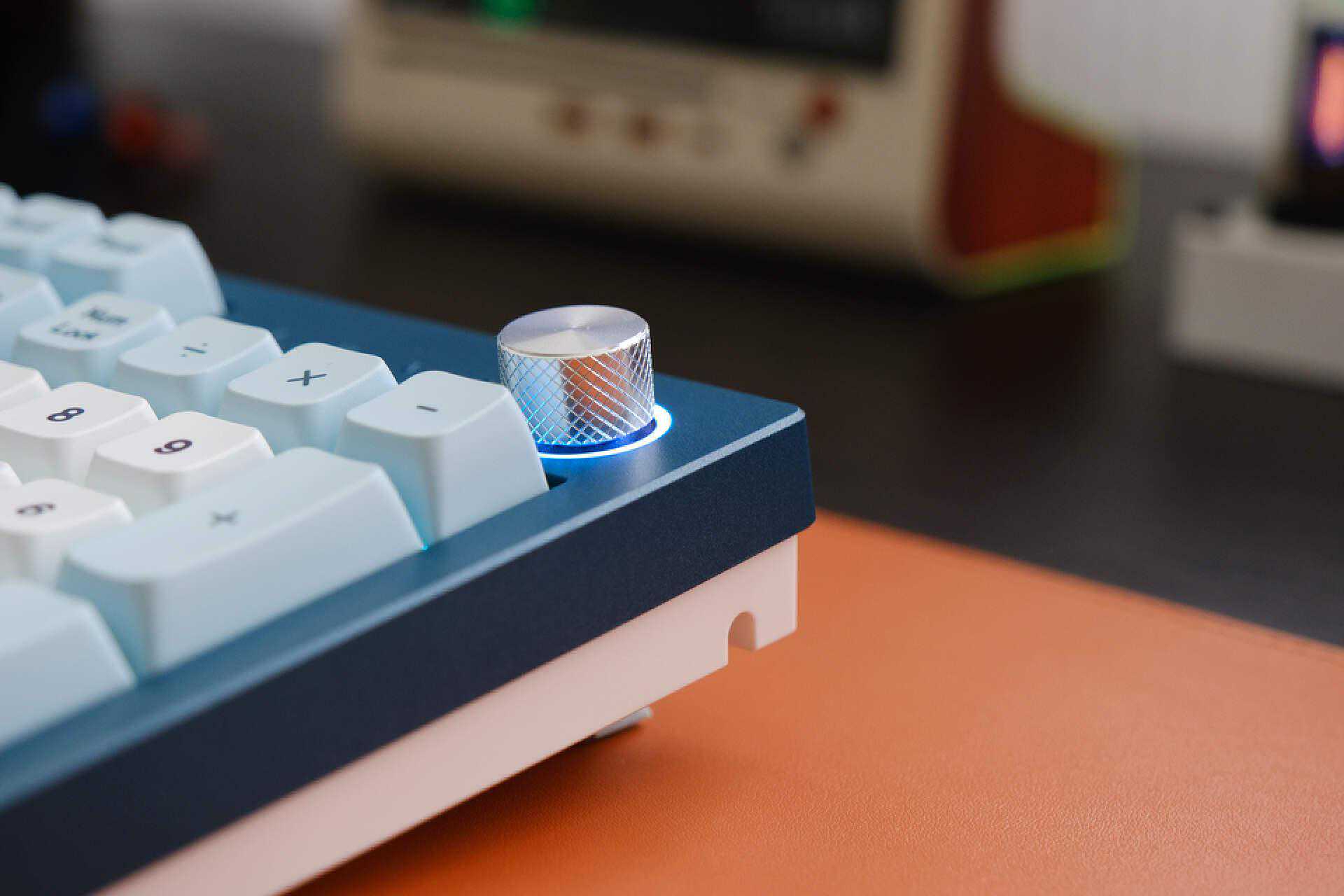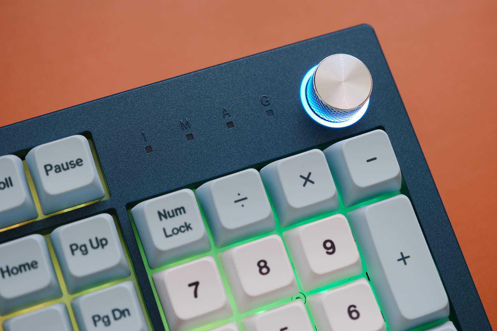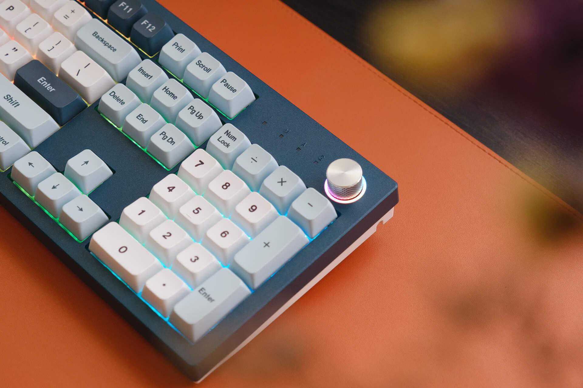 这款键盘右上角旋钮设计是一大亮点,别看它只是一个旋钮,但它拥有3种功能。可以支持灯效切换、音量大小、画面缩放,快捷的操作可以提升使用体验。这个彩色光环可以显示不同颜色,通过按压可以切换功能,此时七彩光环就会显示不同的灯效,非常酷炫。