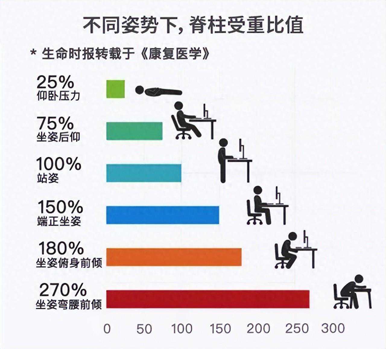 从下图可以看出,在端正坐姿下,脊柱的受力已经是站姿的150%,而大多数人在工作的坐姿往往是最下面两种——这极大地增加了脊柱的负担。