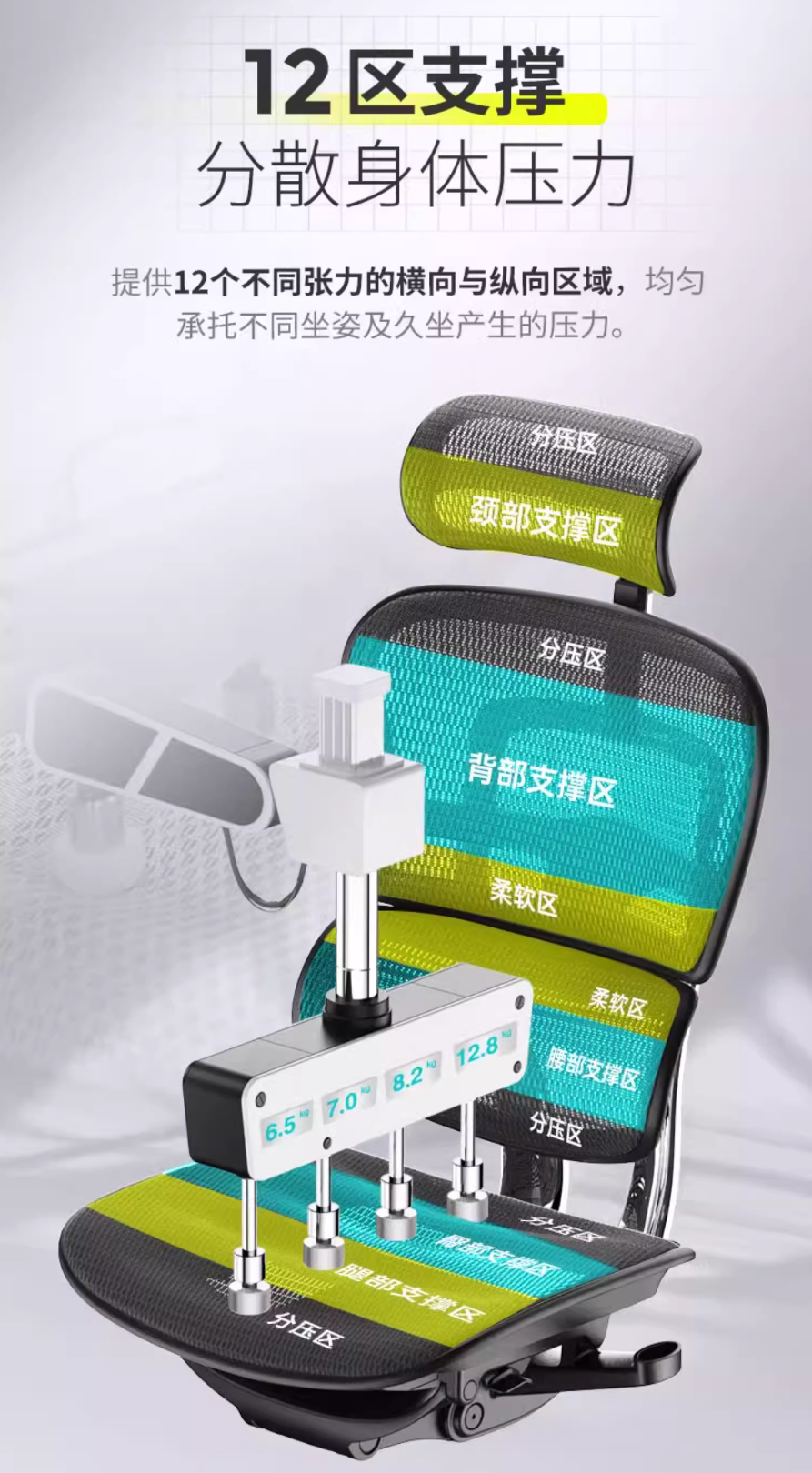 整把椅子的头枕、靠背、腰枕和坐垫通过设计,分成了12个受力区域,每个区域会对应使用者不同的身体部位给到不同的支撑力,让身体接触座椅的每一个位置都能支撑力与舒适度恰如其分