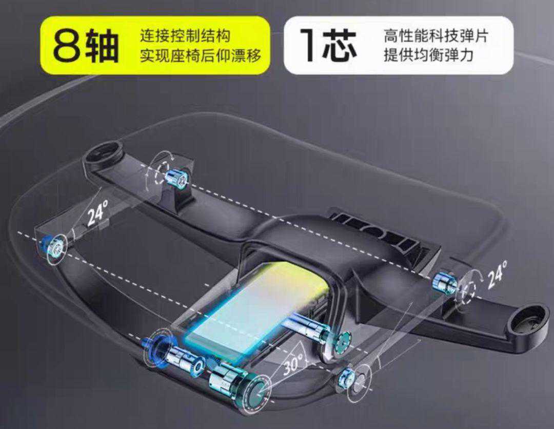 金豪b雄鹰人体工学椅使用的是保友2024年最新自主研发的8轴1芯漂移后仰智能坐姿底盘机构,因为是联动设计,可以在后仰和前倾姿态下,保证腰部支撑的准确性与椅背移动顺滑。