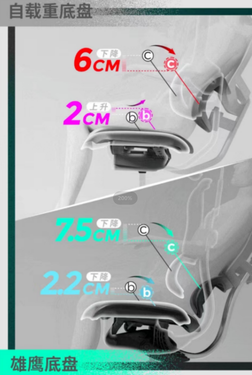 而金豪b雄鹰底盘。座垫随着后仰b点下降2.2cm,同时c点下移7.5cm,是符合人体工学同步倾仰原则,没有顶臀后仰的脊椎受力问题。