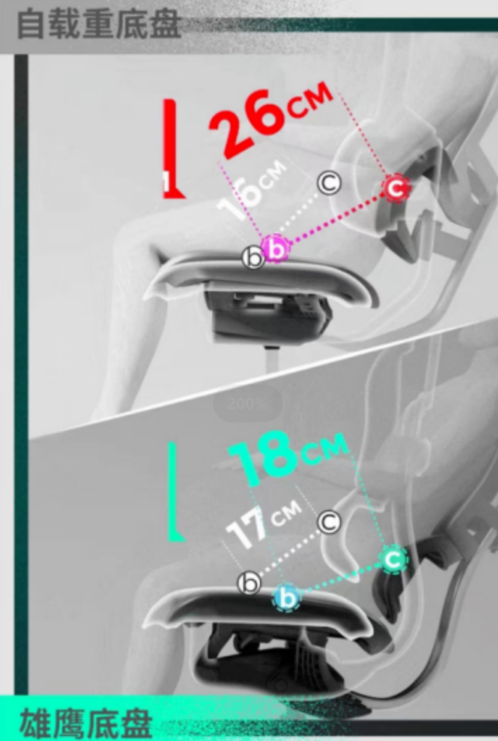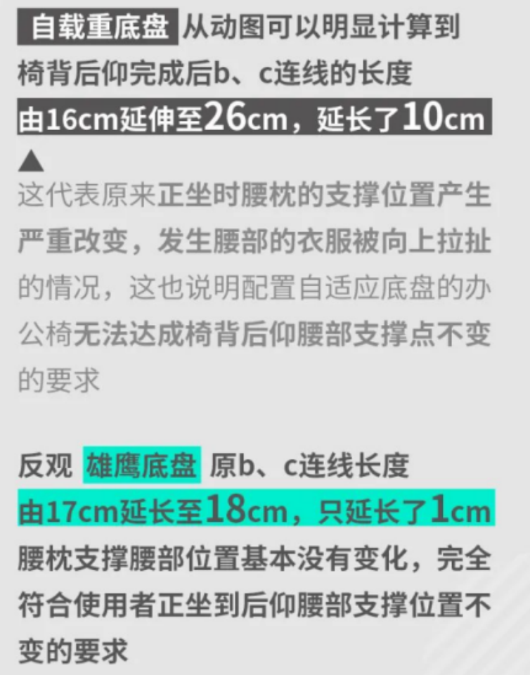 自载重底盘从图可以计算出椅背后仰完成后b、c连线的长度,由16cm延伸至26cm,延长了10cm,这代表原来正坐时腰枕的支撑位置产生严重改变,发生腰部的衣服被向上拉扯的情况,同时也说明配置自适应底盘的办公椅无法达成椅背后仰腰部支撑点不变的支撑需求;反观雄鹰底盘原b、c连线长度由17cm延长至18cm,只延长了1cm,腰枕支撑腰部位置基本没有变化,完全符合使用者正坐到后仰腰部支撑位置不变的要求。