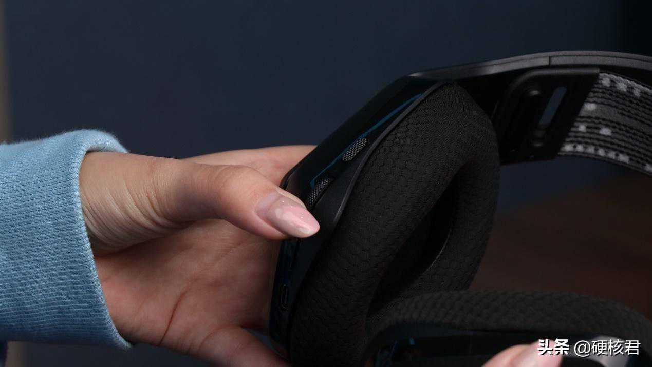 可以看到,罗技G733耳罩采用的是多孔透气的设计,摸上去非常柔软。硕大的字母,十分吸引眼球,这也让我这种经常分不清左右耳的人也能很快地区分。