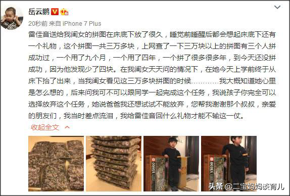那么,家长应该如何给孩子挑拼图呢?相声演员岳云鹏的女儿就属于那种比较安静的,在平时喜欢拼图,雷佳音听说后就送给了小朋友一套拼图。这拼图有多特别呢?共33600片,如果能拼好的话,成品长5.7米,宽1.5米……