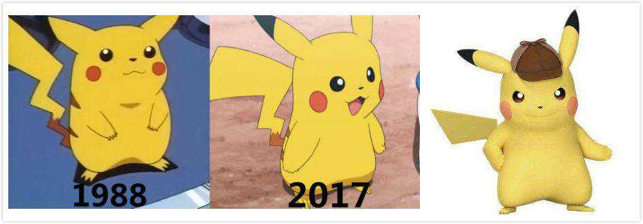 皮卡丘的首次登场是在1992年发售的GB游戏《精灵宝可梦红·绿》中,那时它还有些「发福」。随着知名度的提高,它的身材越来越好了,在明年上映的真人电影《名侦探皮卡丘》中还玩起了英伦风。