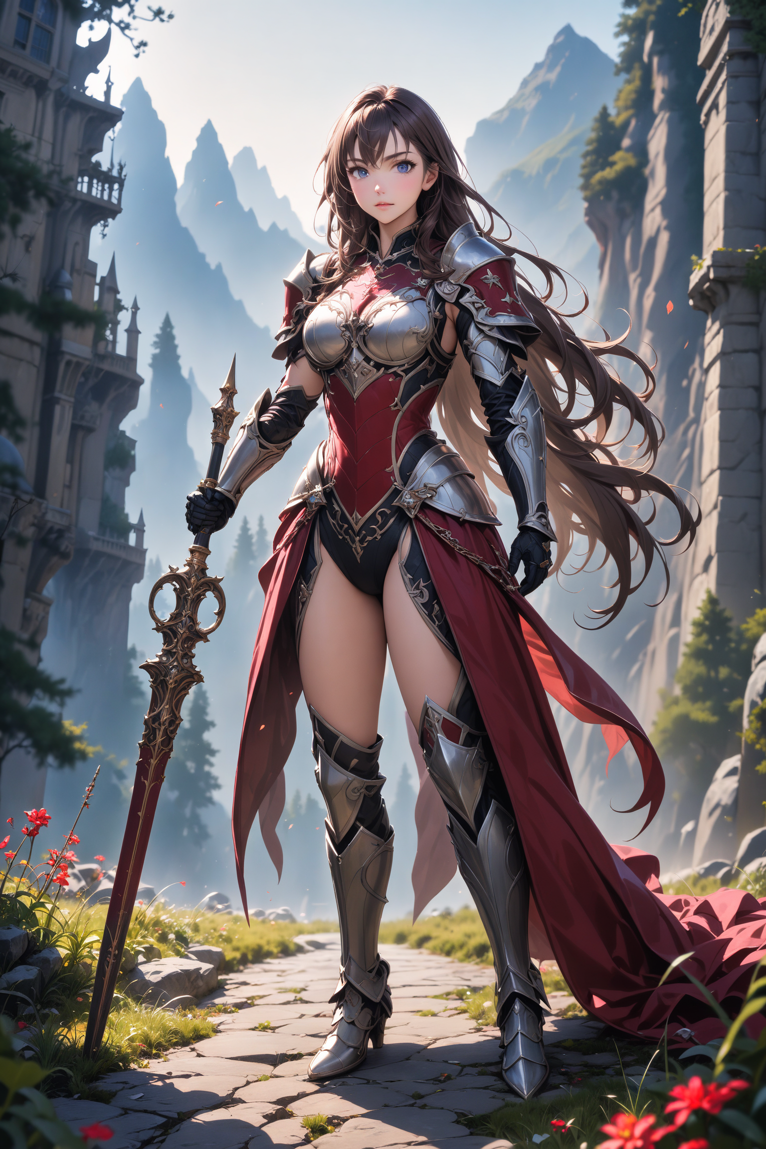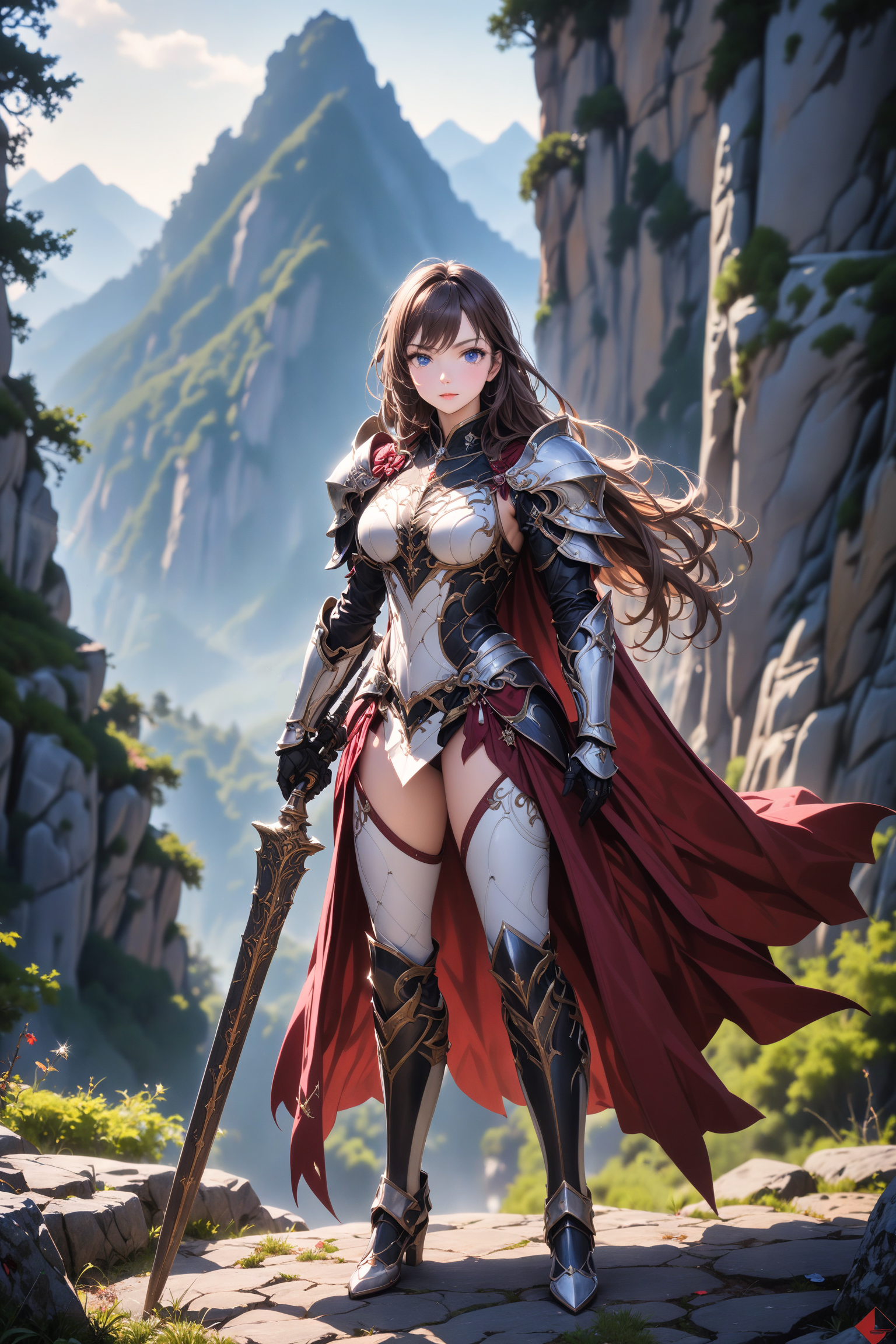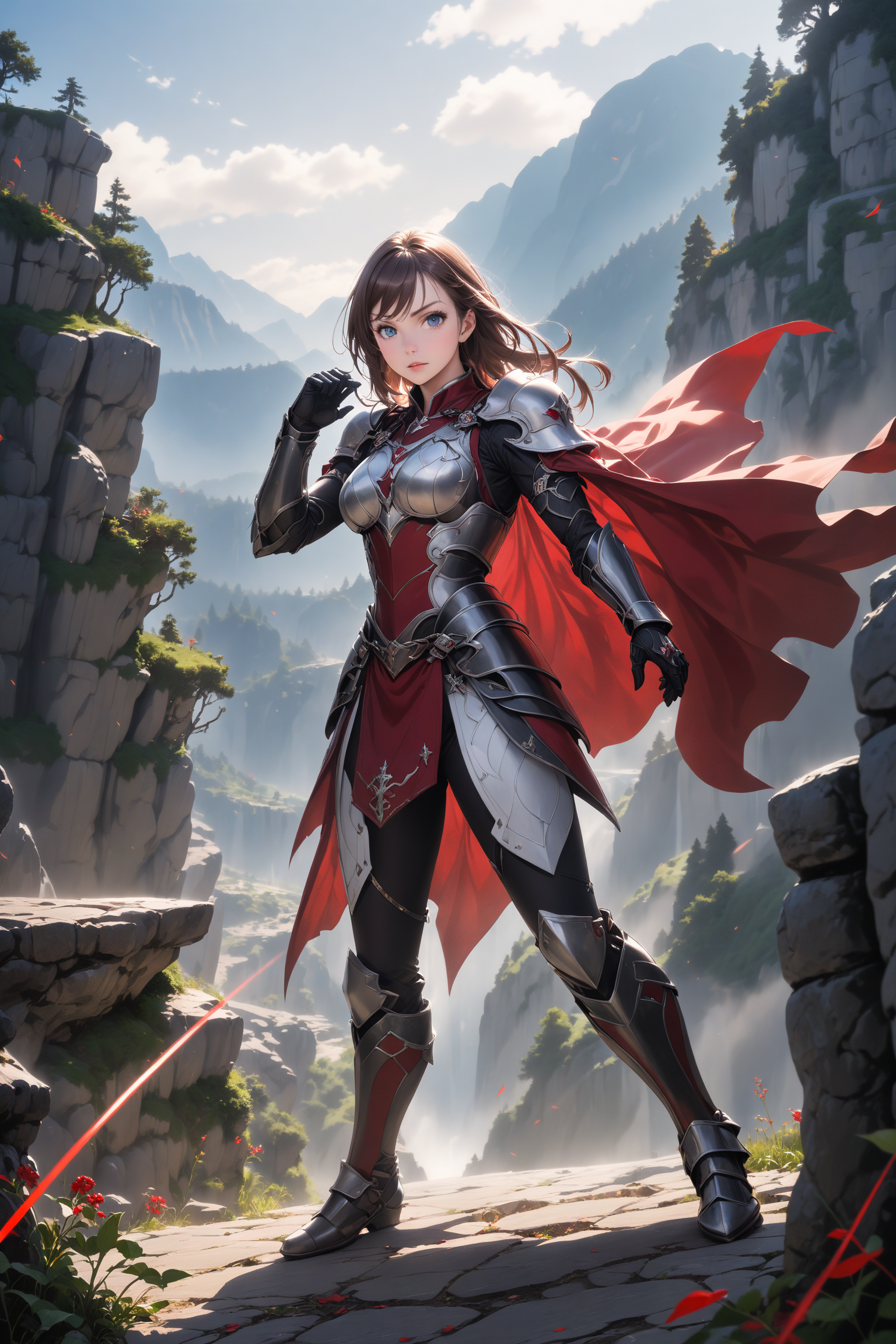 (masterpiece:1.2),(bestquality:1.2),superhighresolution,intricatedetails,ai-generated,perfectanatomyRuleofThirds,emptyspace,lowangleshot,dutchangle,dynamicactions,acharacterportrait,fantasyart,fantasypaladinwoman,girlinwhiteandredknightarmor,solo,(Martialartsmovement:1.2),Randommartialartsmoves,longhair,lookingatviewer,blueeyes,brownhair,standing,outdoors,hemline,cape,armor,blurrybackground,shoulderarmor,gauntlets,pauldrons,mountain,dynamiccomposition,(masterpiece:1.2),(bestquality:1.2),superhighresolution,ai-generated,perfectanatomy,