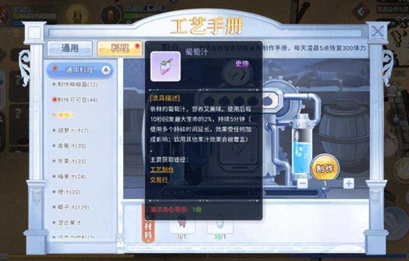 当然了,还有专门为美食爱好者准备的料理手册。丰富的美食制作方法可是能满足每一位资深吃货的需求哦!无论食材收集,还是烹饪步骤,这里都一应俱全,任由您发挥所长。而且,不同等级的料理所需的食材和工具也是有所区别的哦~美味饮料同药品一样,葡萄汁可恢复生命值,胡萝卜汁则有助于增加法力值。