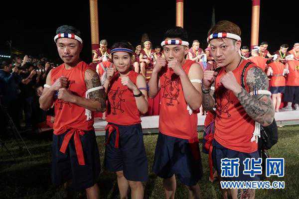新华网泰国大城(陈家宝杨舟)在泰国古老都城的落日下,千余名不同肤色、身着清一色深红泰拳服的拳手们逐一面对高座上的40位泰拳师傅行双手合十礼,低头接受大师为其戴上头箍,并齐跳拜师舞。