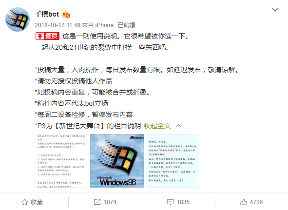 每周二,是“千禧bot”的“设备检修”日,停更休息。这点也很有怀旧味道——过去,很多电视台会在周二下午停播,进行设备检修。