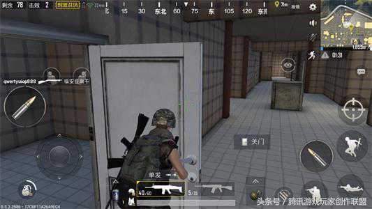 打个比方,比如我们在楼顶观察时看到对面二楼有人在搜寻装备,这时如果想偷掉他们把装备占为己有,就要利用好听声辩位以及视野优势来打击掉对手了。在刺激战场中,如果附近有脚步声或枪声时,右上的小地图会有大概的位置提示。这时我们可以根据位置提示来靠近对手,然后利用对方视野外的视野优势来观察、淘汰对手。这一点同样可以适用于全局中,在整理好行进路线思路后,我们就可以用这两点小技巧来注意击破路线中的敌人。