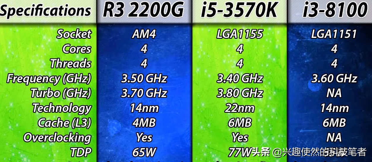 本次的测试平台,R32200G采用了ASRockB450Pro4MoboMobo主板,i5-3570K为GigabyteGA-Z68-D3HMobo,i3-8100是GigabyteB360M-DS3HMobo,内存R32200G和i3-8100统一为2*8GBDDR4RAM@2400MHz,而i5-3570K只能支持到DDR3,所以选用了16GBDDR3RAM@1866MHz。显卡为MSIGTX1070GamingX。三颗CPU的具体参数如下: