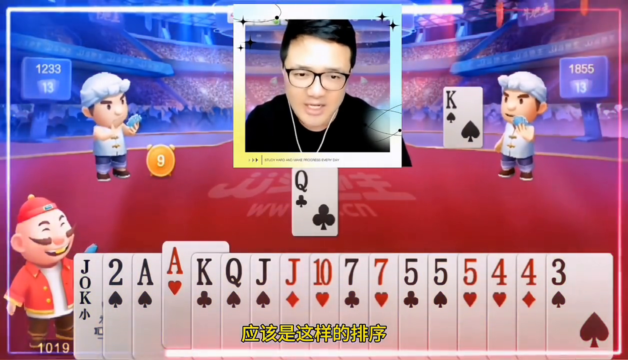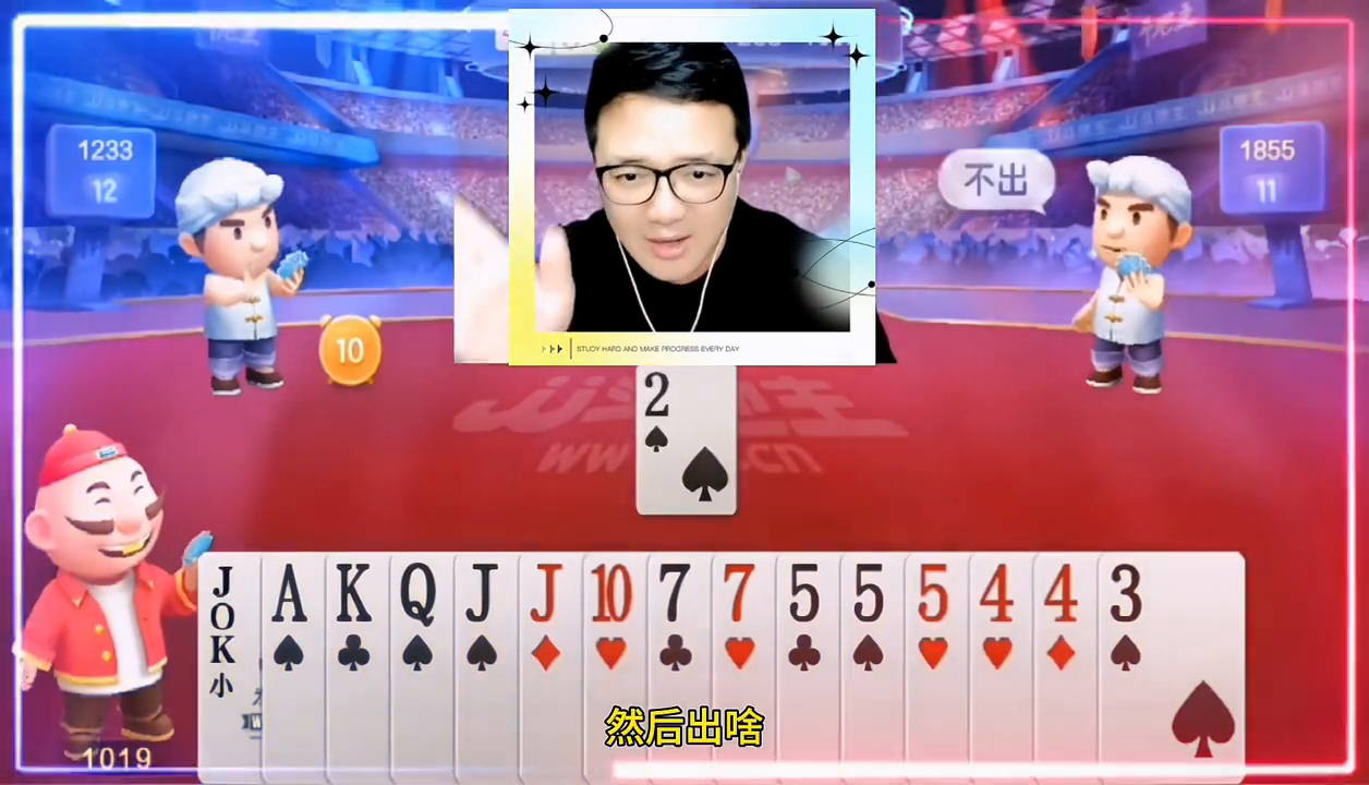但这牌咋调就有说道,你看我教你们,兄弟们我先上二然后出啥,注意点位,注意点位,出圈顶下加圈就不要下家进这个圈,然后他k我尖正好吃掉上家2,那我这个小王可以揍他了,因为什么呢?现在下外边还有一个2,一个王,大王打我,小王以后大概率会出单,为什么?因为他有绝2,出3,出3这个时候不能上10,上10他圈我k我10越级了,这个时候应该出啥呢?应该拆7让下家,就是出圈,他打的不错,他也没越级,他8打我7,那我10打他8,我10他应该圈,然后我再k,把外边2打下来以后,我的对勾就单双全控了,他圈我k,现在2下来以后,咱们对勾已经明大了,但是他出对,不过对4还不够,希望他继续出单,因为从上家的视角看,他也不确定外边这个大牌的分布了,已经蒙圈了,被我拆的现在脑瓜子嗡嗡的。