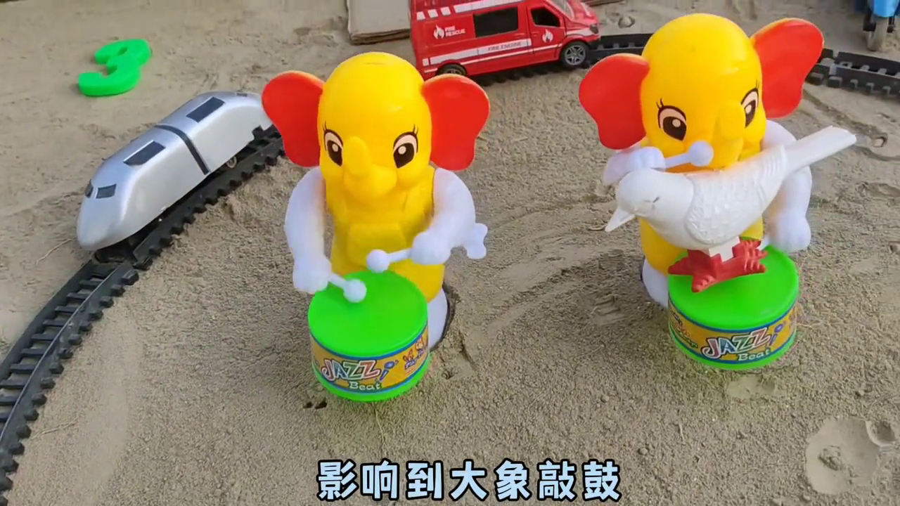 小鸟,快点飞走,影响到大象敲鼓。白色小鸟赶紧飞走,我们不想敲鼓了,想回家。把你送上大象车,大象车准备出发,带着小象们回家。消防车快点离开火车轨道,这里才是你的路。火车继续出发了,直升飞机快点出来,准备启动。