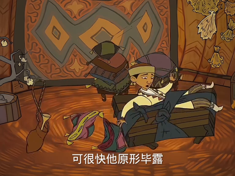 随着可汗摘下帽子,一根硕大的角竖立在他的头顶,少年不由得大吃一惊,随后便操起匕首,开始为可汗剃头。可汗通过匕首折射出的光,看到了自己锃光瓦亮的脑袋,很满意少年的手工,便说要奖励少年,告诉他角落里的那个宝箱内装满了黄金,让他自己去拿黄金。