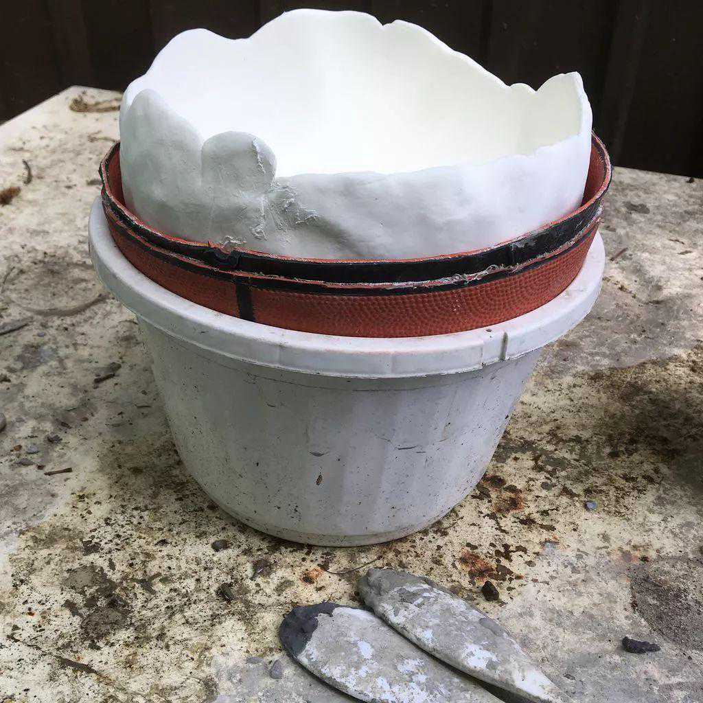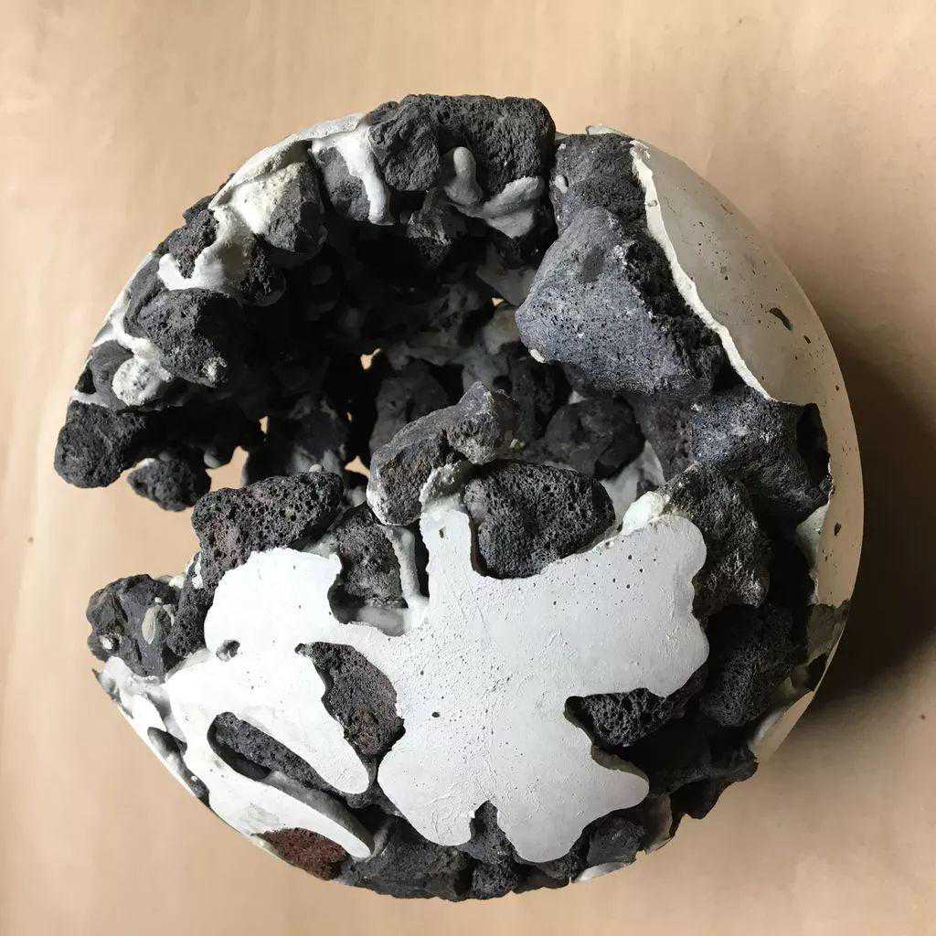 将原本已经凝固的混凝土重新添加进去,这样一个球状的混凝土石头花盆就制作出来了。