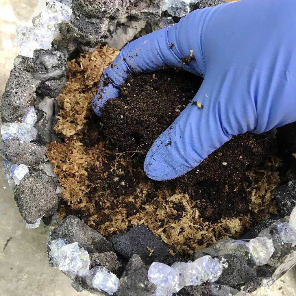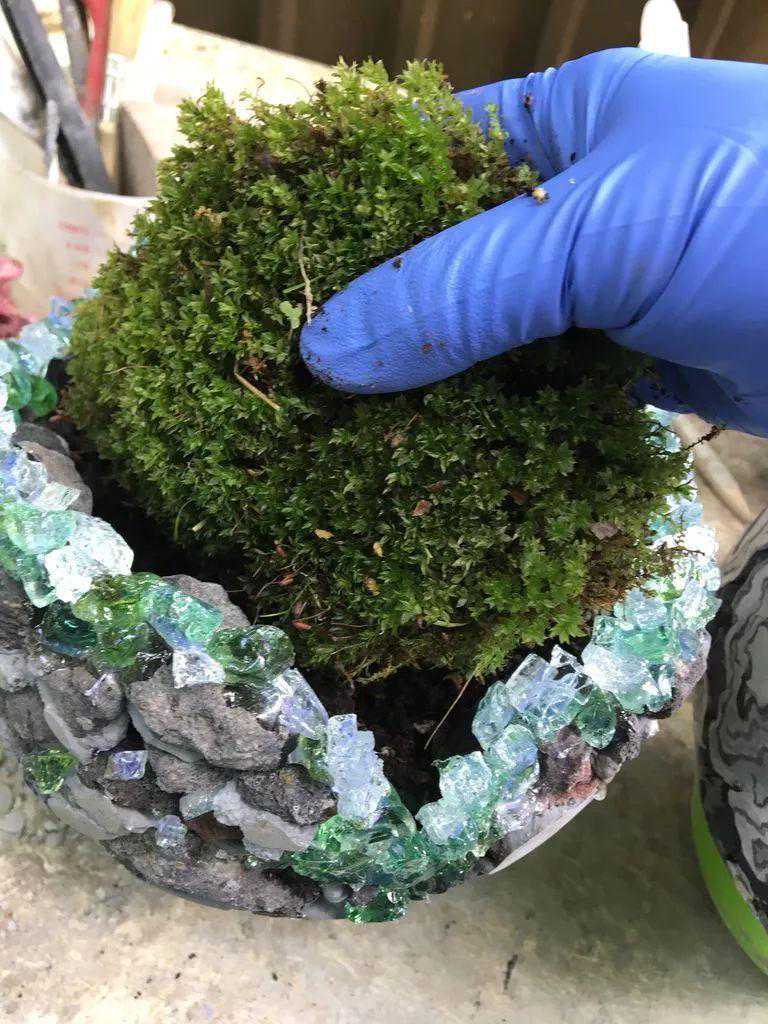 最后就需要用到水苔,是垫在容器的底部的,使用前要用清水浸泡,沥干水分,之后铺在整个石头水泥花盆的底部,再慢慢添加土壤,这次还用到了一些新鲜的苔藓,苔藓要带土种上去的时候要用力压实,让苔藓和土壤充分接触,如果没有压实苔藓,后期会慢慢变干。
