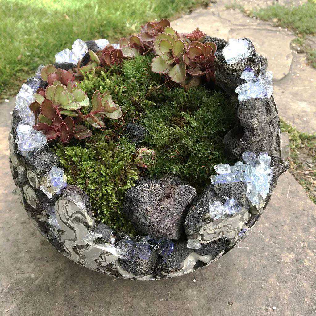 在整个石头水泥花盆下面可以垫上一些小鹅卵石,防止它滚动,这个DIY星球植物景观你是否会喜欢呢?