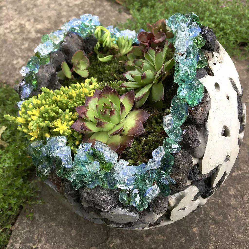 制作时就是用热熔胶将玻璃水晶固定在水泥石头花盆上面,制作的过程是比较简单的,将这些玻璃水晶添加上去之后会让整个石头水泥花盆看起来更加精致,有一种闪亮的色泽,整个花盆看起来就像星球一般。