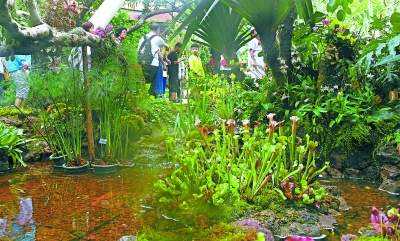 除此之外,在青果榕广场,20多盆猪笼草被悬挂在盘桥下,距离地面足有6米高。而不远处的兰花墙下,则主要布置尺寸较小的迷你食虫植物。