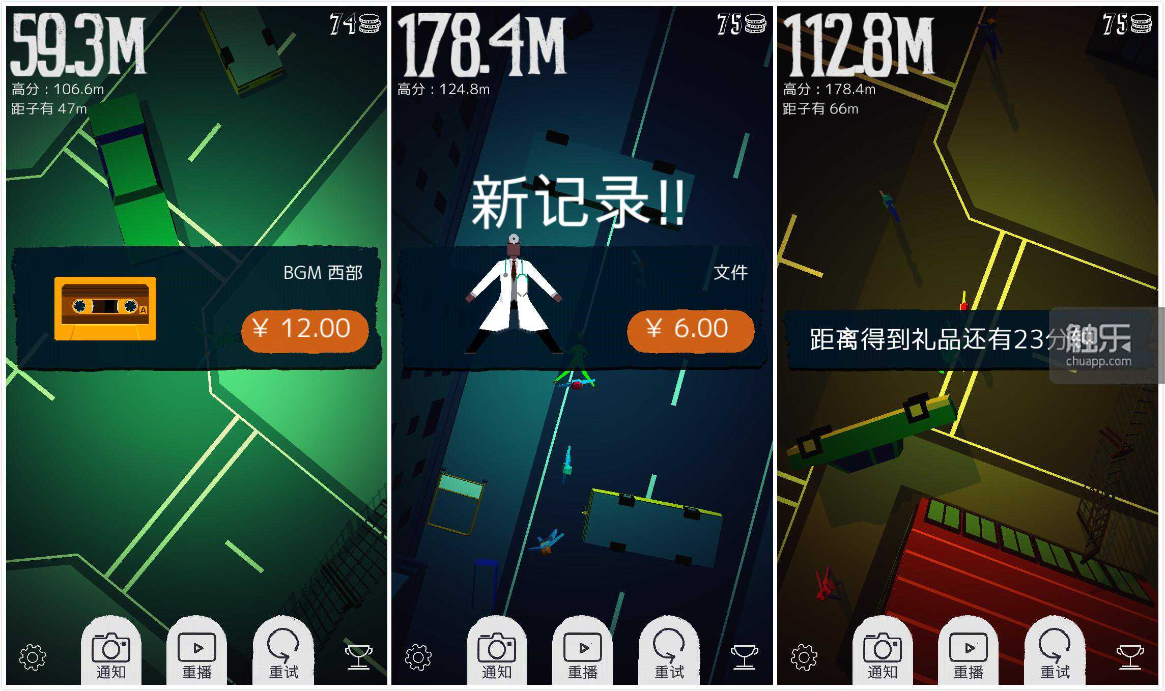 《1000米僵尸逃亡》的玩法简单,制作者也没有在每个角色上做更多的玩法突破,造成了整个游戏后继乏力。虽然只要跑出去1000m就可以迎来胜利的曙光,但也没什么足够的奖励激励,当年的《飞机大战》还能发到朋友圈炫耀一番自己到底飞了多远呢!