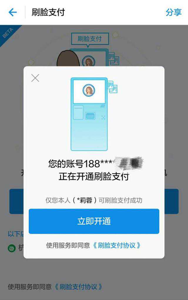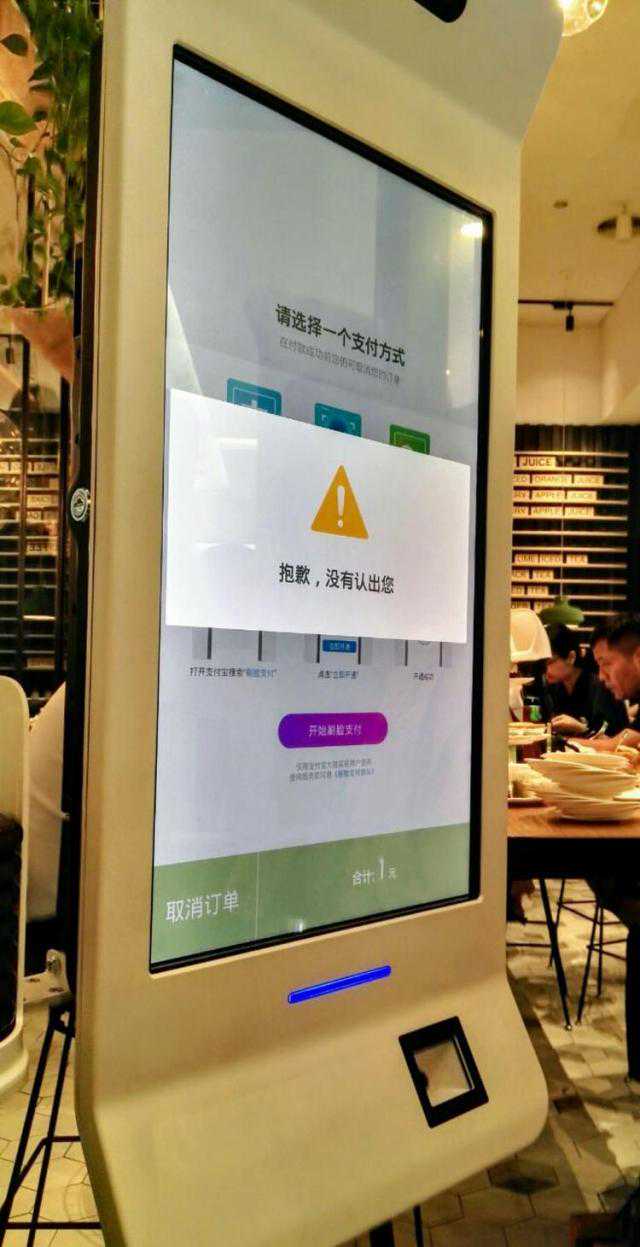 如果想要体验这个刷脸支付功能,第一次使用时需要先扫描现场二维码或者在支付宝中搜索“刷脸支付”,开通功能。之后,在支付环节选择“刷脸支付”,看向点餐机上方的摄像头,让机器识别你的脸,随后再输入你的手机号,如果识别成功,那支付就完成了。