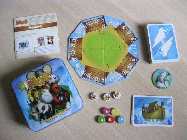 开始前的准备:年龄最小的游戏者为起始玩家,随机抽取5张动物牌,按照下图进行配置:5搜船停在木板前,并将诺亚token随机放在一艘船上。然后分配给每位玩家8张动物牌。