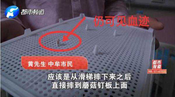 这款玩具是普通的塑料材质,并不坚硬。但是翻过来,在蘑菇钉钉板背面,有几个尖头凸起。正是这几个凸起的塑料钉,伤了孩子。