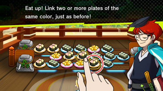 关于动画说了什么和世界观我就不剧透了。值得一提的是本游戏支持触屏操作。不过嘛,手柄实测下来,游戏体验非常好,消除的时候指向性很高,对战起来肯定是要比触屏来得快。基本就是同颜色的盘子连着划可以消除,同种寿司连着划可以消除。