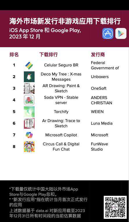 根据发布的2023年12月海外新应用下载榜,本期共有20款新游戏应用,6款新非游戏应用下载量突破100万。榜单第一名分别是开放世界游戏GTA:SanAndreas,以及工具类应用CelularSeguroBR。