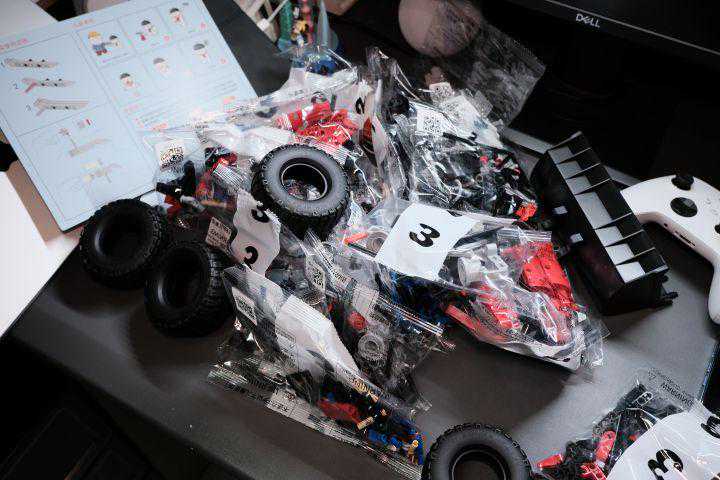 拆箱之后就是各种小零件了,总共有16包,并且按照1、2、3做了标记,拼接的时候按照顺序进行组装即可,这一点非常好评,可以减少每次整理零件的数量,找起来方便很多。除此之外就是轮胎和大铲斗,相比于之前买的小乐高,这款装载机是没有纸质说明书的,需要下载电子版对照拼搭。
