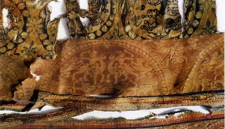 这件织物有四组纹饰,不过它们呈现对称的形态,而对称正是这块织物的一个特点。这块织物上有着许多人物、动物的图案,仿佛在讲述一个故事,具有不同于当时中原文化的异域风情,体现出极高的艺术价值和考古价值。正因如此,红地云珠日天锦成为了中国首批禁止出国展览的文物。