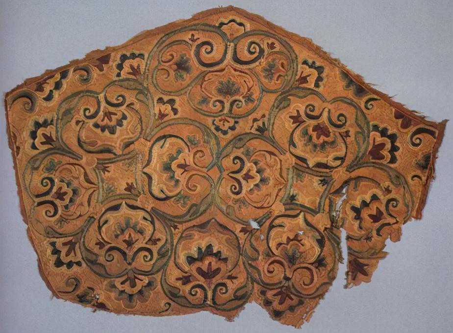 红地云珠日天锦出土时是三个残片,虽然尺寸不大,但相对完整,可以比较清楚地辨别出纹理。在考古人员对其进行清理修复后,这件织物展示出了它真正的模样。
