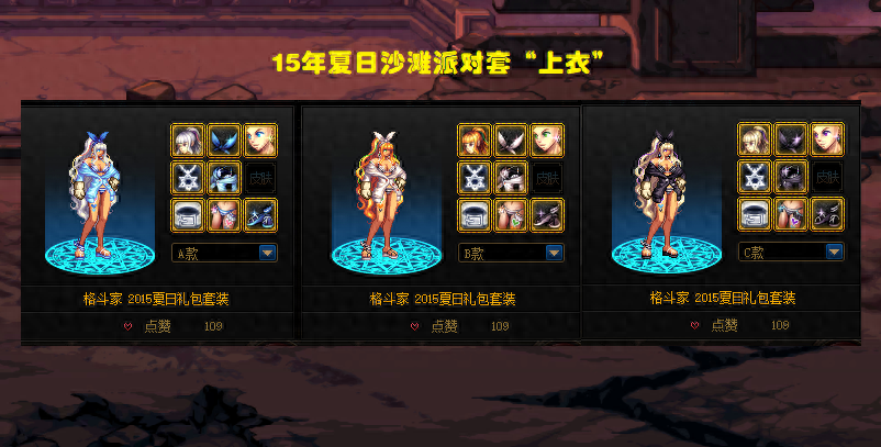 15年夏日套整体表现都不错,比基尼+光脚板,很有夏日风情,而其中最为推荐的还是女格斗上衣,斜穿着一件外套,半遮半掩若隐若现,很有一种慵懒的感觉,这款上衣得到了许多女格斗玩家好评。