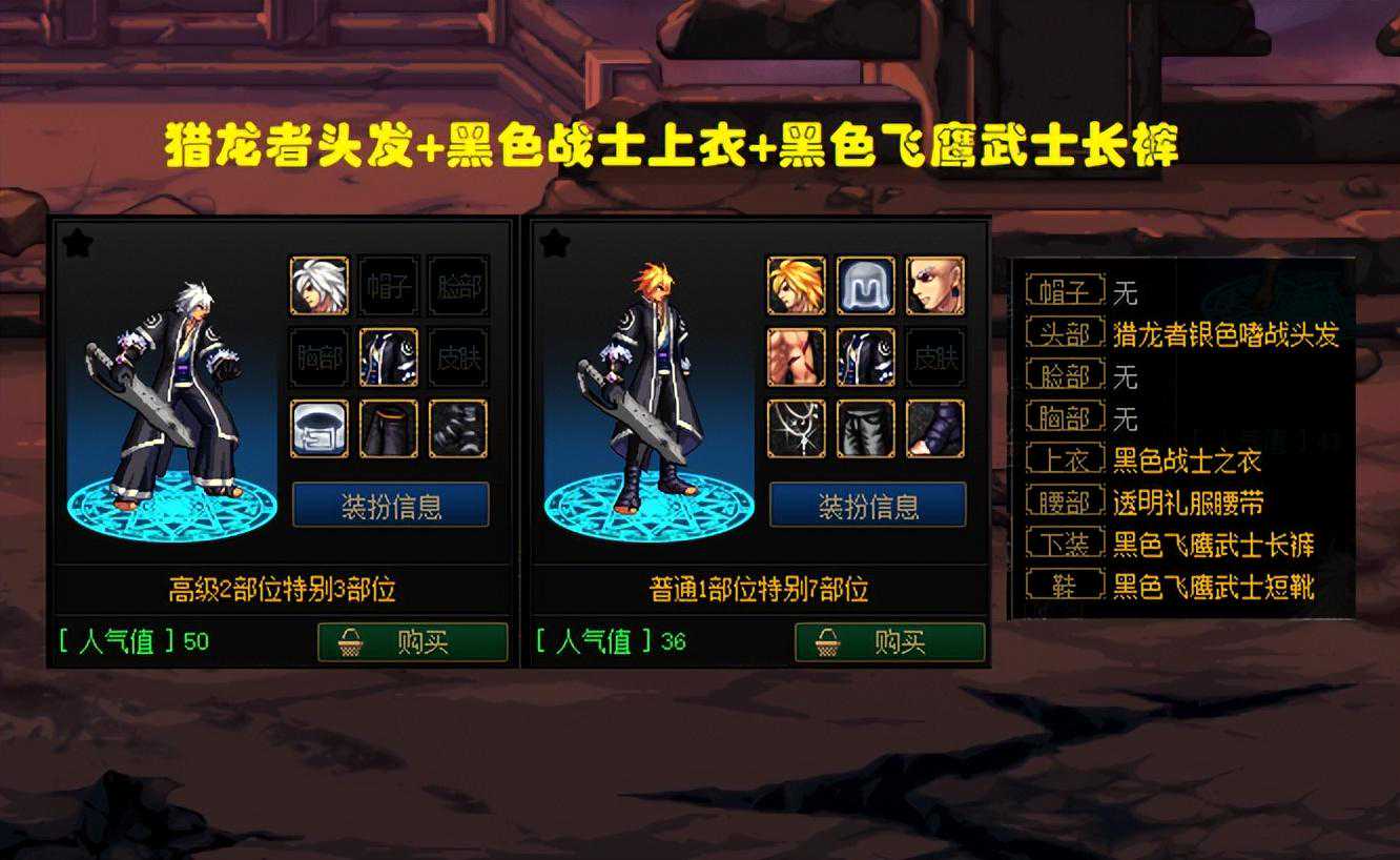 分别是“猎龙者头发”“黑色战士上衣”,以及“黑色飞鹰武士长裤”。