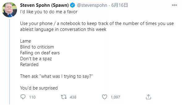 早在今年六月,无障碍游戏倡导者StevenSpohn曾经提出过这个问题。在人们的日常用语中,总是会习惯性地使用某种疾病的症状或者对残障人士的称呼来作为比喻。用“Fallingondeafears”来表示充耳不闻,用“That'slame(瘸腿)”来形容事情变得很糟。