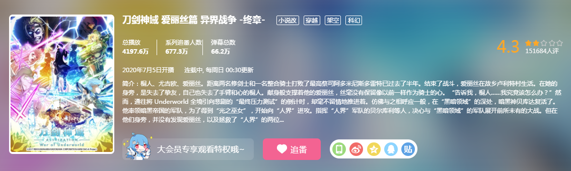 可惜整个制作组拿着这么一手好牌却玩出了现在这么个局面,《刀剑神域爱丽丝篇异界战争》终章在B站的评分在今天已经跌到了4.3分,看这个势头如果18话没有什么重要转机,可能要跌破4分了,播放量也只有4000千多万,如果分到单集播放量的话远低于其他同期的动画。