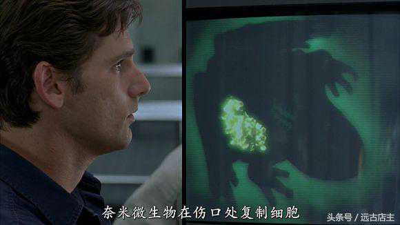 到了晚上,布鲁斯还在实验室对血液样本进行实验,他人物是奈米微生物的作用使他能够存活下来,其实那些青蛙血液也有奈米微生物,青蛙死了,而布鲁斯却活下来,他发现自己的血液可能存在一些不一样的东西。