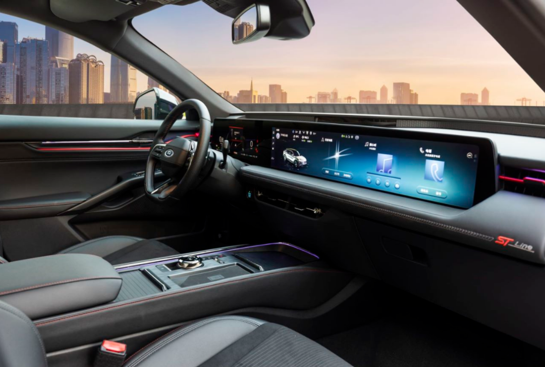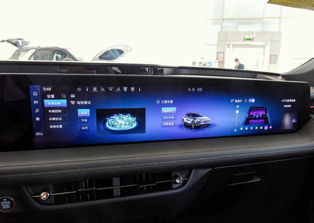如果说外观看着不像一台燃油车的话,那来到车内这一感受会更强。都说车内大屏就新势力玩儿得好,但EVOS车内这块1.1米长的巨幅屏幕,在传统燃油车上可太少见。它由一块12.3英寸液晶仪表和27英寸真4K屏组成,配备SYNC+2.0智行互联系统,能实现主副驾协同操作。在设置导航、操作娱乐系统等功能上,副驾也能帮司机分担部分任务。