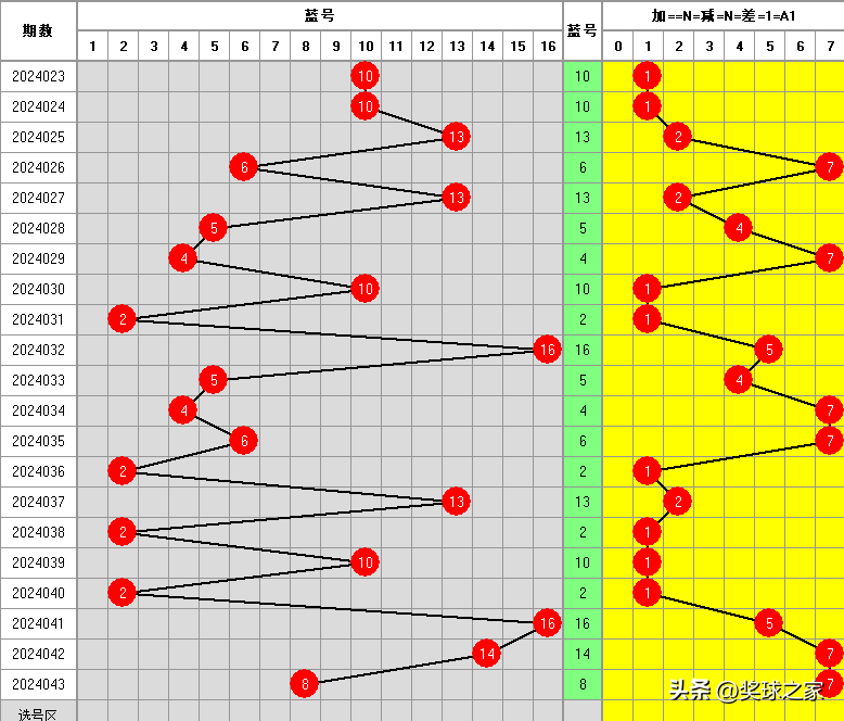 一、24044期双色球蓝号分析:利用“加N”或“减N”产生差值尾为1,判断蓝号范围