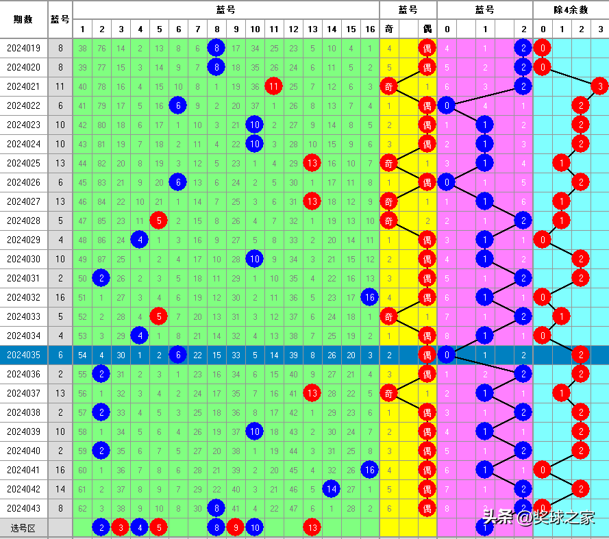 再结合近期蓝号走势判断,一是防上期蓝号08除以4余0的同为0路的号04、08。二是最防冷号01;