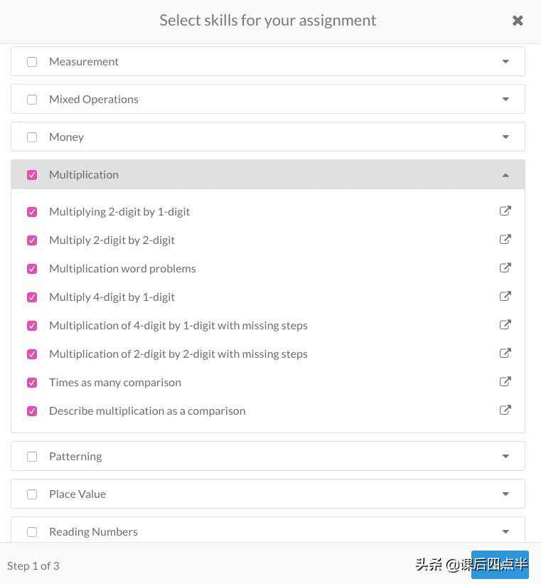 通过选择想要定位的乘法技能来创建作业。还可以使用此工具来区分各种技能水平。