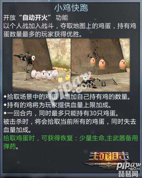 在这个模式下,打枪的不要,偷鸡蛋的要的。在三分钟内谁获得的鸡蛋最多谁就是赢家,收集鸡蛋可以扩大HP,最高提升到1000HP,鸡蛋可以补小部分的HP。可见鸡蛋的营养价值是极高的。