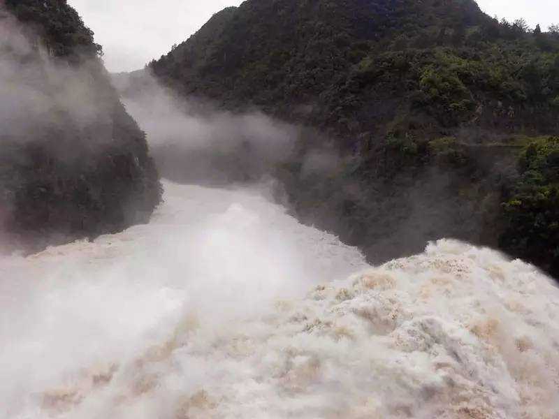 洪水大洞位于遵义市播州区西坪镇竹山村。洪水大洞为地下暗河,平时水流潜伏地下,静若止水,如涓涓细流、波澜不惊,当雨季来临的时候,洪水汹涌澎湃,穿山而出,从岩壁上坠落,因出口处落差和出口众多而形成壮观的瀑布群。洪水大洞有洞口瀑布群、地下暗河、清水河、湘江、攀岩绝壁、竹山跳墩等景点。洪水大洞风光旖旎、水碧山青、巧夺天工,集山、水、洞为一体。优越的自然环境使其在周边景区中独树一帜,散发出独特的魅力。这里的洞奇、山青、水秀、人文景观比较丰富,能让游客陶醉于青山绿水之中。