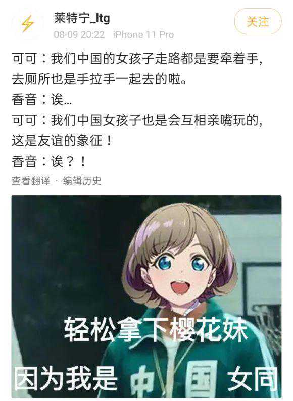 虽然不少网友都很想反驳这明明是励志番搞什么百合,但仔细想想,无论是拉手一起上厕所这种事情以及亲嘴玩这种事情好像在国内确实是经常发生啊。