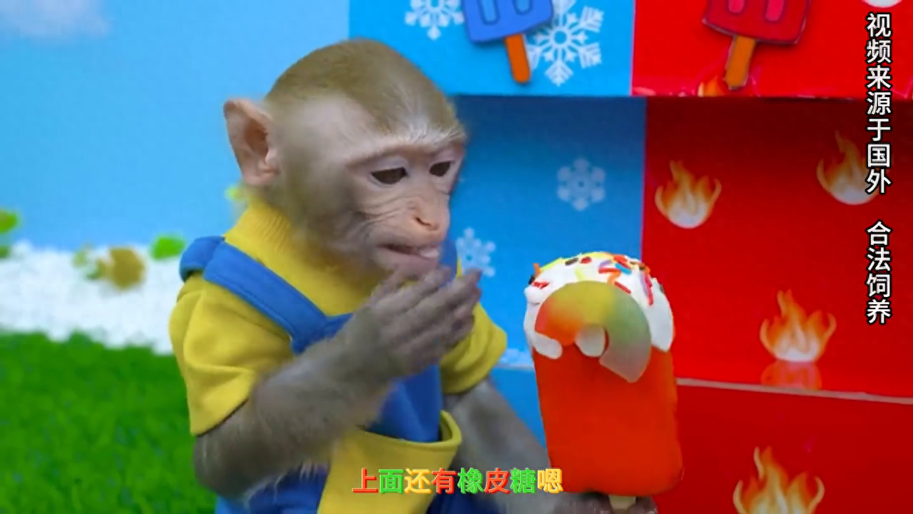 再来看看这边的,来个蓝色的,可能我就能好了。果然是个蓝色的冰激凌,这蓝色冰激凌还不错。我先来吃个橡皮糖,好吃,味道真不错,真的是,今天太幸福了,吃了两个冰激凌。看看我的手,好像这回变成蓝色了,这是什么情况?我也想吃冰激凌,能不能给我个冰激凌?你想吃冰激凌吗?你这是怎么了?怎么变成这样了?吓死我了,你没事吧?这事不能怪我小猴子,我也不是故意的,我就一碰你,你就变成这个样子了,我就很抱歉。