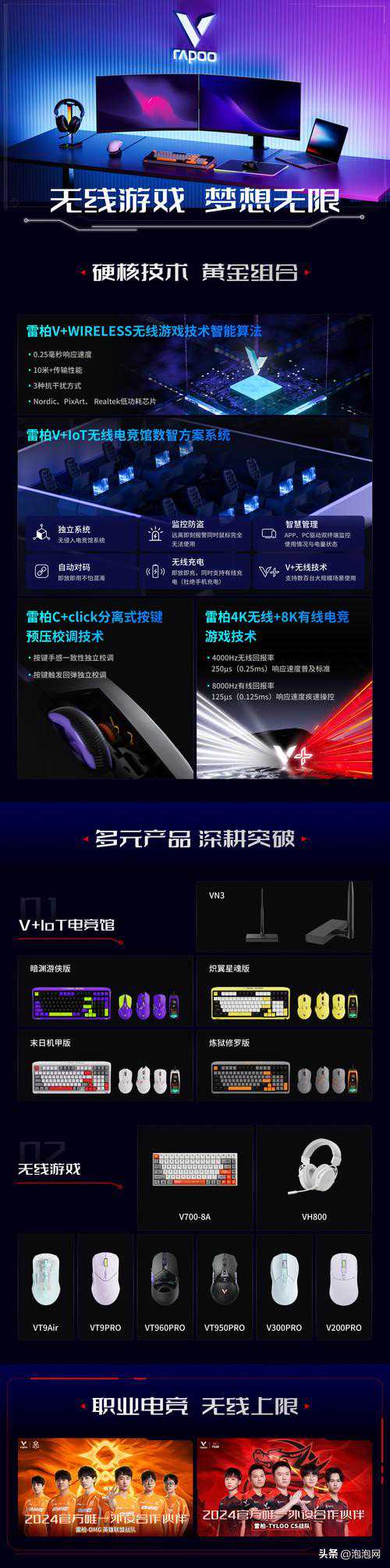 2023年下半年,雷柏推出自研4K无线+8K有线游戏技术,VT9Air和VT9PRO双高速双模版首搭上线。2024年3月,基于雷柏软件技术的先发优势以及行业的经验积累,正式发布新固件,全面更新底层算法。