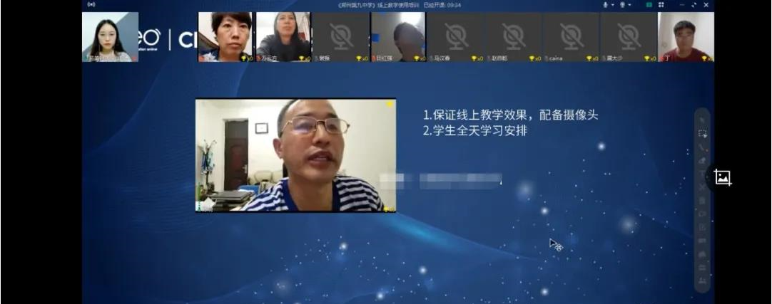 8月4日下午4:30,郑州九中高三年级邀请classin平台技术人员共同组群,开展第一次《郑州九中classin线上教学使用培训》。校长张莹、副校长陈晓及相关处室领导参与会议。新软件功能多、分工细,对初次接触的老师们来说,可谓是操作陌生、状况百出。培训会持续了将近2小时,但培训结果却不尽如人意。