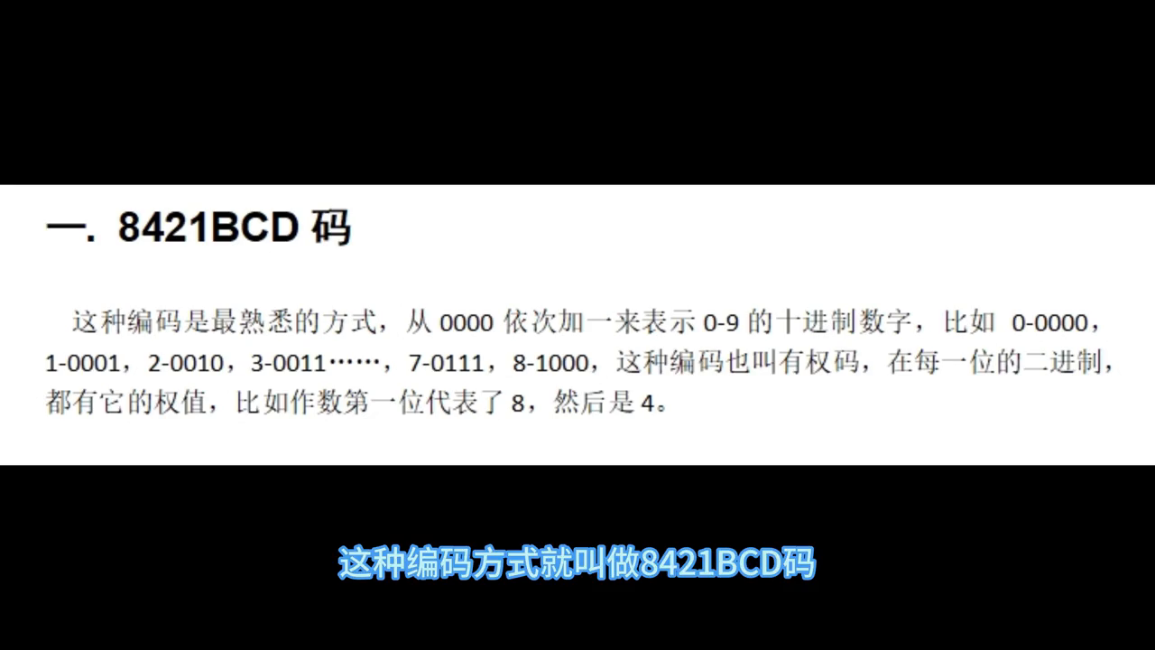 ·第一种8421BCD码是一种加权编码,具体看一下。这种编码对于了解编码系统的人来说是最熟悉不过的,就是很正常的从0一直往上加即可。比如一代表0001,二代表0010,30011,以此类推。这样在每一个位表示一,就是它的对应的全值。比如在最后一位一,代表的是1,然后是2,然后是4,然后是8。这种编码方式就叫做8421BCD码。